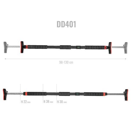 DD401 jest regulowany w zakresie 98-130cm. dzięki czemu można go dopasować do różnych rodzajów drzwi. Montaż jest bardzo prosty i nie wymaga specjalistycznych narzędzi, Drążek posiada wbudowany klucz nasadowy, drążek jest również łatwy do przechowywania i transportu, co czyni go idealnym wyborem dla osób, które chcą ćwiczyć w domu lub w podróży.