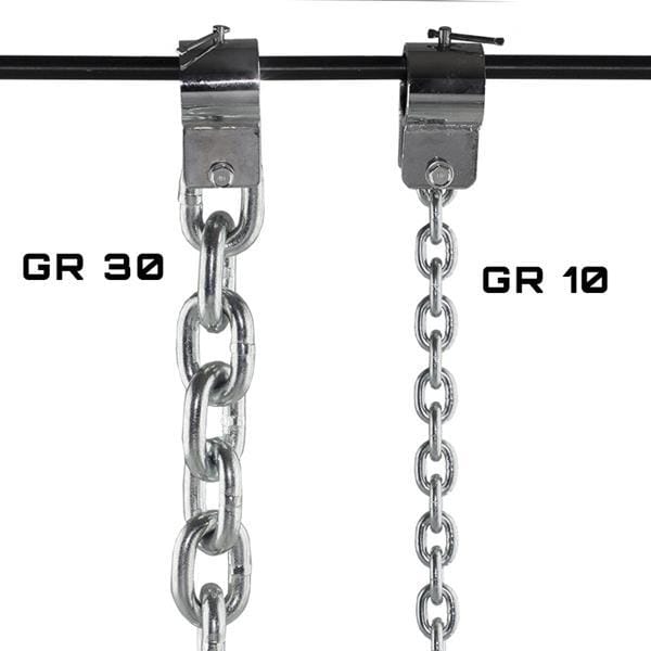 GR30 HMS – to dwa wytrzymałe łańcuchy do zawieszenia na sztandze. Produkt został wykonany z wysokiej jakości stali. Ten wytrzymały materiał jest niezwykle odporny na wpływ otoczenia. Praktyczny i trwały system montażu na sztandze, powoduje, że jest to uniwersalny przyrząd do użytku w domowej siłowni. Polecamy go tym wszystkim, którzy chcą w pełni zrealizować potencjał, jaki niesie za sobą trening z ciężarami. Poszczególne ogniwa każdego z łańcuchów odrywając się od podłoża zwiększają ciężar sztangi. Waga sztangi uzyskuje maksymalną wartość w najwyższym punkcie fazy wznoszącej ruchu. Odwrotnie dzieje się podczas opuszczania sztangi. Wówczas ciężar zmniejsza się proporcjonalnie do ilości łańcucha znajdującego się na podłodze. Łańcuchy GR30 HMS korzystnie wpływają na procesy fizjologiczne, zachodzące w mięśniach podczas ćwiczeń. Polega to na wykorzystaniu zjawiska poaktywacyjnego wzmocnienia siły skurczu (PAP) – siła mięśni rośnie, jeżeli po fazie ich wstępnej aktywacji, następuje maksymalne wzmocnienie siły skurczu. Wykorzystanie łańcuchów w treningu siłowym rozwija również szybkość ruchów.