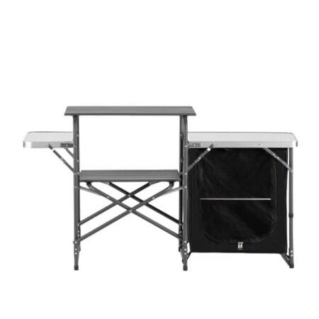 To wyjątkowe rozwiązanie dla miłośników kempingu, którzy cenią sobie komfort i funkcjonalność. Wytrzymała konstrukcja szafki połączona z eleganckim designem sprawia, że jest to must-have każdego podróżnika. Składane, boczne blaty oferują przestrzeń nie tylko do przygotowania posiłków, ale także do ich serwowania. Dzięki otwartym półkom i przestronnej szafce zamykanej na zamek błyskawiczny, przechowywanie produktów spożywczych jest nie tylko wygodne, ale i bezpieczne. Gdy potrzebujesz więcej miejsca, blaty możesz z łatwością złożyć, co czyni szafkę jeszcze bardziej kompaktową. Niezależnie od tego, czy planujesz grilla, piknik czy kameralne spotkanie wśród natury, nasza szafka turystyczna z osłoną sprawdzi się idealnie.