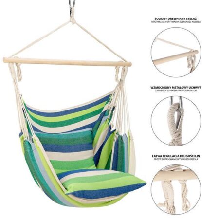 Tego typu krzesła, nieznacznie przypominają hamak, jednak są dużo prostsze w montażu. Wynika to z faktu, że wieszamy je za jeden uchwyt. Daje to możliwość, montażu w domu, na balkonie, w ogrodzie lub nawet, zabranie naszego ulubionego fotela na camping. Będą również alternatywą, gdy nie ma aż tyle miejsca, by powiesić hamak. Wzmocniony, stalowy uchwyt, pozwoli długo i bezpiecznie użytkować krzesło.