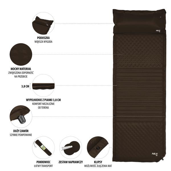 Plażowanie, camping czy też spanie na świeżym powietrzu, pod namiotem to z pewnością ulubione atrakcje, wielu z nas. Jednak dla naszej wygody, potrzebny jest dobry sprzęt. Oryginalne maty samopompujące marki NILS CAMP, zagwarantują komfort użytkowania, niezależnie od warunków, w jakich się znajdziemy. Przedstawiamy model NC4001, który występuje z poduszką.
