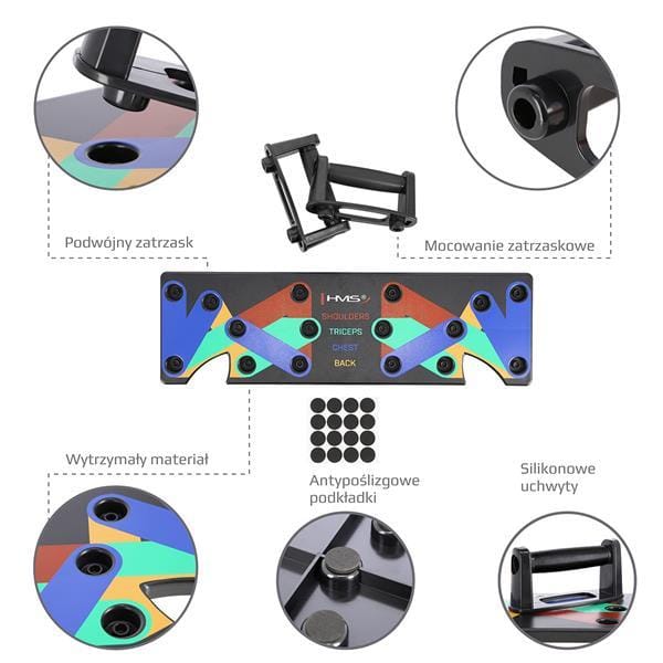PU10 MULTI marki HMS, to innowacyjna i wielofunkcyjna deska, służąca do wykonywania ugięć ramion w podporze przodem, czyli tzw. pompek.