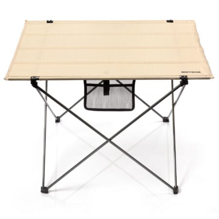 Stół turystyczny Meteor Viator to kompaktowe i niezwykle praktyczne rozwiązanie dla miłośników aktywnego wypoczynku na łonie natury. Skonstruowany z lekkiego, a zarazem wytrzymałego aluminium, oferuje stabilność i długotrwałość, a dzięki poliestrowej tkaninie Oxford 600D pokrywającej blat, wyróżnia się dużą odpornością na zachlapania i łatwością w czyszczeniu – w razie zabrudzenia wystarczy przetrzeć go wilgotną ściereczką.