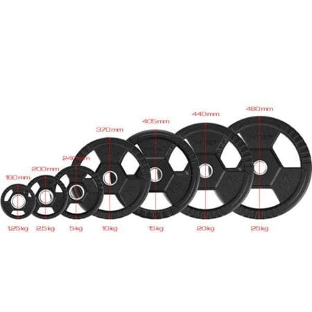 Perfekcja wykonania nie tylko pozwala docenić walory estetyczne talerzy TOH ale również sprawia, że ich ergonomia jest na najwyższym możliwym poziomie. Trzy uchwyty w każdym, nawet najmniejszym talerzu pozwalają na szybką i komfortową zmianę obciążenia. Ponadto bez przeszkód można ich użyć jako alternatywy dla hantli.
