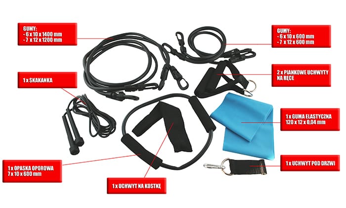 Zestaw zawiera: 4 gumy oporowe, 1 gumę elastyczną, 1 opaskę oporową, 2 piankowe uchwyty na ręce, 1 uchwyt na kostkę, 1 uchwyt pod drzwi oraz skakankę.