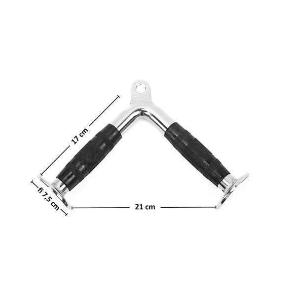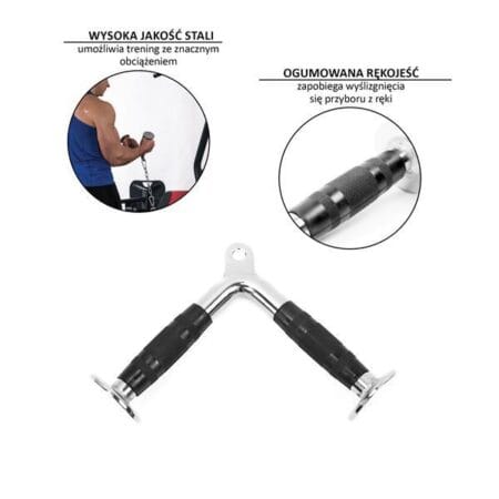 Jego trójkątny kształt umożliwia wykonanie ćwiczeń pod alternatywnym kątem do uchwytu prostego. Pozwala to na wykonanie efektywnego treningu oraz daje możliwość pełnego rozwoju całego mięśnia i wszystkich jego głów mięśniowych. Ogumowana rękojeść zapewnia pewny i komfortowy chwyt. Dzięki temu możemy skupić się na dokładnym wykonaniu ćwiczeń, nie przejmując się tym, że uchwyt wyślizgnie się z rąk. Wykonany jest z wysokiej jakości stali, co daje możliwość treningu ze znacznym obciążeniem.