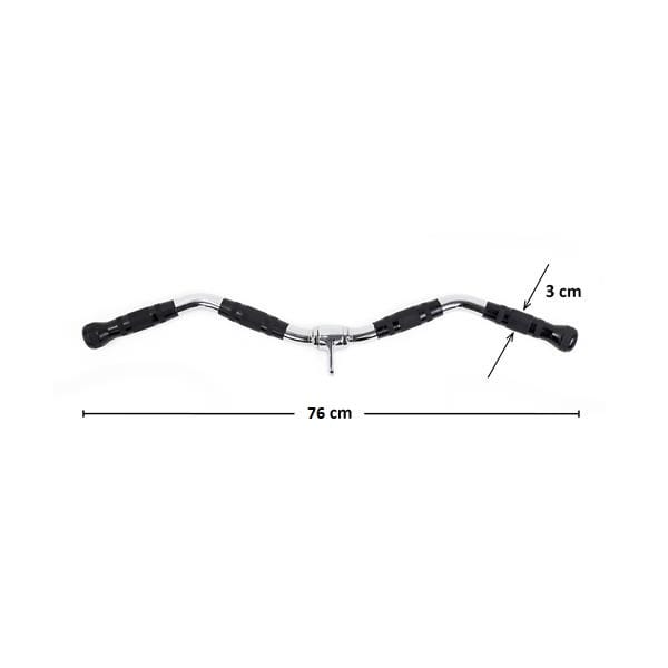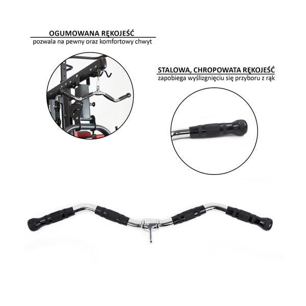 Długość drążka oraz rozstaw rękojeści dają możliwość ćwiczeń na wąskim i szerokim uchwycie. Skutkuje to efektywnym treningiem. Rękojeści ustawione są pod kątem. Dzięki temu w trakcie każdego ćwiczenia angażują alternatywne przyczepy mięśniowe w stosunku do prostego uchwytu. Ogumowana rękojeść pozwala na pewny oraz komfortowy chwyt, co zapobiega wyślizgnięciu się przyboru z rąk. Uchwyt wykonany jest ze stali. Umożliwia to trening ze znacznym obciążeniem.