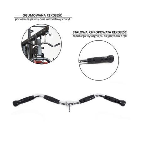 UW13 HMS to drążek przeznaczony do treningu na wyciągu górnym i dolnym. Można wykorzystać go do całej gamy ćwiczeń na różne grupy mięśniowe górnych partii ciała zaczynając od małych grup mięśniowych, jak biceps i triceps, przez przedni i boczny akton mięśni naramiennych, aż po mięśnie najszersze oraz prostownik grzbietu.